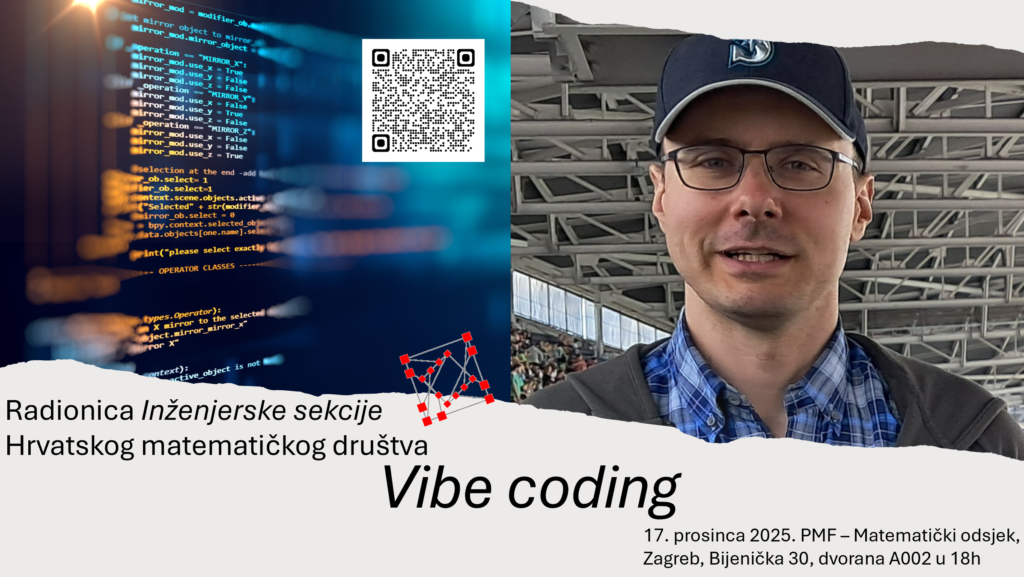U organizaciji Inženjerske sekcije HMD-a u srijedu 17. prosinca 2025. dr. sc. Tvrtko Tadić će održati radionicu o korištenju AI-a u programiranju pod nazivom “Vibe coding”. Radionica će se održati uživo PMF – Matematički odsjek, Zagreb, Bijenička 30, dvorana A002 s početkom u 18h, a ako budemo u mogućnosti s obzirom na tehničke uvjete, trebalo bi se prenositi i putem Zoom-a. Za prisustvovanje radionici molimo da se prijavite do utorka 16. prosinca 2025. putem sljedeće poveznice: