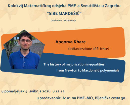 U sklopu Kolokvija Sibe Mardešić PMF-Matematičkog odsjeka u Zagrebu, Apoorva Khare (Indian Institute of Science), održat će znanstveno predavanje pod naslovom The history of majorization inequalities: from Newton to Macdonald polynomials. Predavanje će se održati u ponedjeljak 4. svibnja 2026. u 12:15 u predavaonici A101 u zgradi Matematičkog odsjeka PMF-a, Bijenička cesta 30, Zagreb. Više informacija možete naći ovdje.