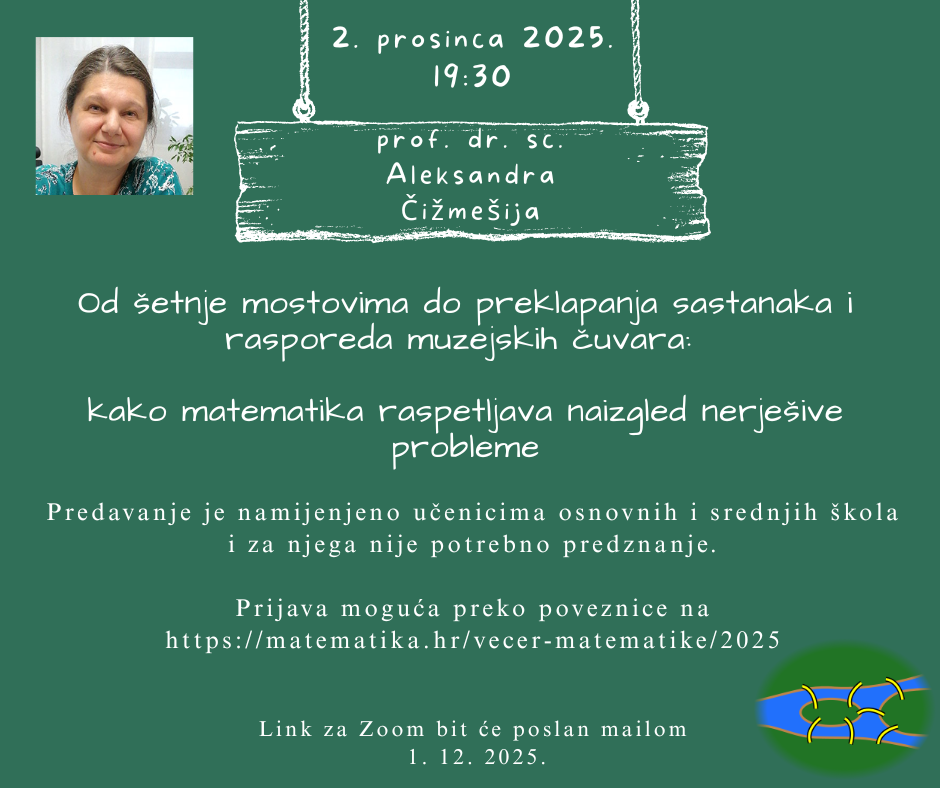 Sažetak: U predavanju ćemo vidjeti kako problemi preklapanja sastanaka, bojenja karti, šetnji mostovima i raspoređivanja čuvara u muzeju postaju mnogo lakši ako ih prikažemo na pravi način. Dobro odabrani grafički prikaz otkriva strukturu problema, a upravo se u tome krije snaga elementarne teorije grafova. Jednostavnim primjerima pokazat ćemo kako matematika pretvara zbrku u jasnoću i vodi nas do elegantnih rješenja. Predavanje je namijenjeno učenicima osnovnih i srednjih škola i za njega nije potrebno predznanje.