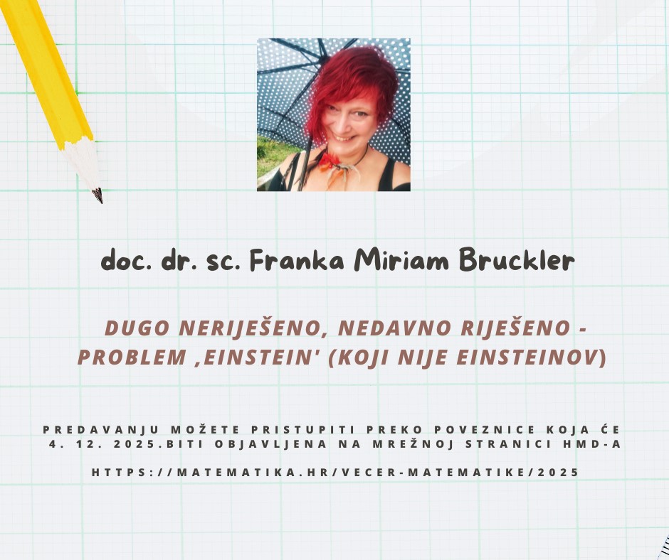Sažetak: Prije tri godine na Večeri matematike pričali smo o neriješenim matematičkim problemima, a jedan od njih bio je “Problem aperiodične pločice” (https://youtu.be/kZV3Tp2soIQ?si=cJWg-2V1awHsUwtD). Za razliku od ostalih tada spomenutih neriješenih matematičkih problema, ovaj je u međuvremenu riješen: Prošle je godine dokazano da postoji pločica, jedna jedina – popularno zvana ,einstein’, ne zbog znamenitog fizičara, nego jer to na njemačkom znači jedan kamen – takva da ako napravimo njene kopije i krenemo popločavati primjerice pod kupaonice, kako god mi slagali, uzorak se nikad neće ponavljati. U ovom predavanju kratko ćemo opisati povijest periodičkih i aperiodičkih popločenja ravnine, njihovu primjenu u kristalografiji i umjetnosti, te put od otvorenog problema do njegovog rješenja.