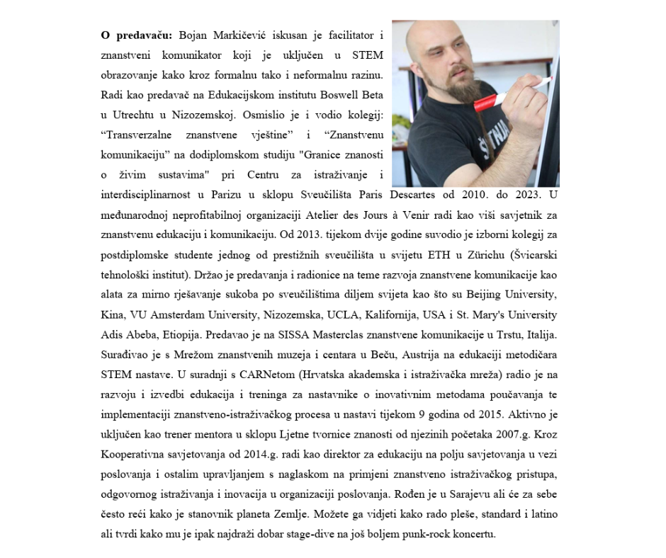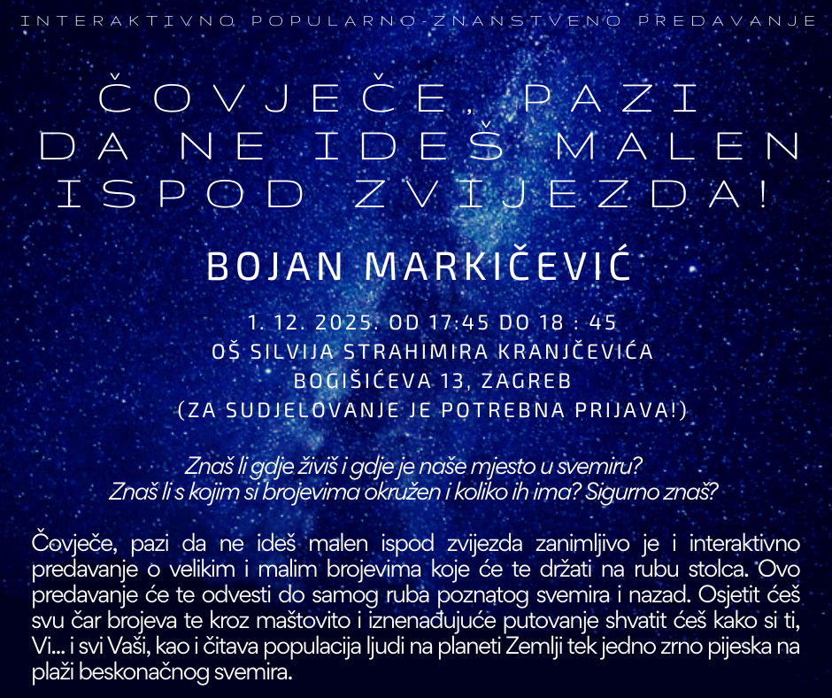 Sažetak: Znaš li gdje živiš i gdje je naše mjesto u svemiru? Znaš li s kojim si brojevima okružen i koliko ih ima? Sigurno znaš? Čovječe, pazi da ne ideš malen ispod zvijezda zanimljivo je i interaktivno predavanje o velikim i malim brojevima koje će te držati na rubu stolca. Ovo predavanje će te odvesti do samog ruba poznatog svemira i nazad. Osjetit ćeš svu čar brojeva te kroz maštovito i iznenađujuće putovanje shvatit ćeš kako si ti, Vi… i svi Vaši, kao i čitava populacija ljudi na planeti Zemlji tek jedno zrno pijeska na plaži beskonačnog svemira.